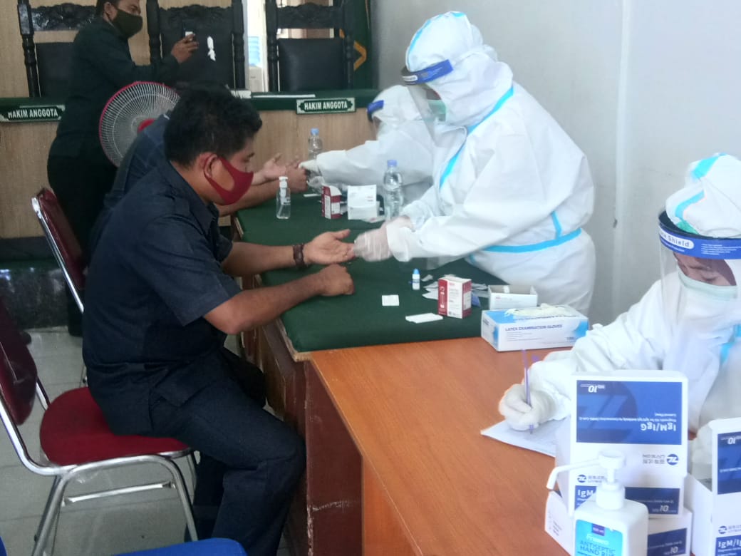 Guna memastikan tidak terpapar coronavirus disease (Covid-19), seluruh aparatur Pengadilan Negri Sei Rampah mengikuti rapid test internal Senin (15/6). Proses rapid test dipusatkan di Ruang Sidang Utama Pengadilan Negri Sei Rampah