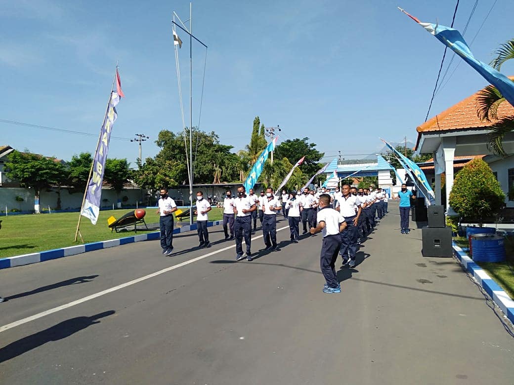Pasca uji terampil penilaian lomba Lanal teladan se Indonesia Komandan dan Prajurit Mako Lanal Banyuwangi bersama pengawak kapal KRI Karang Pilang – 981 yang merupakan kapal angkut pasukan (TNI dan Polri / Korps Brimob) laksanakan olahraga bersama di lapangan apel Mako Lanal Banyuwangi, Jumat, (6/11/2020).