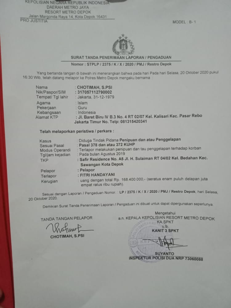 Terkini, bermodalkan bukti-bukti transaksi dengan pelaku, IM beserta Suami sudah melaporkan perkara tersebut ke pihak berwajib yakni, Polrestro Depok.