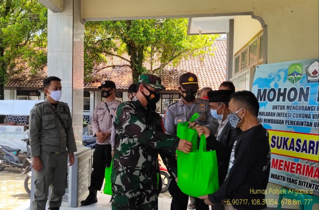 “Polsek Argapura Polres Majalengka Polda Jabar bersama Koramil, Camat, Sat Pol PP dan Perangkat Desa menyalurkan paket sembako berupa beras seberat 5 Kg sebanyak 80 Paket beras disalurkan kepada warga relawan dan penggali kubur Jenazah Covid 19 di Wilayah Kecamatan Argapura. Ungkap Kapolsek Argapura IPTU Sarjiyo.