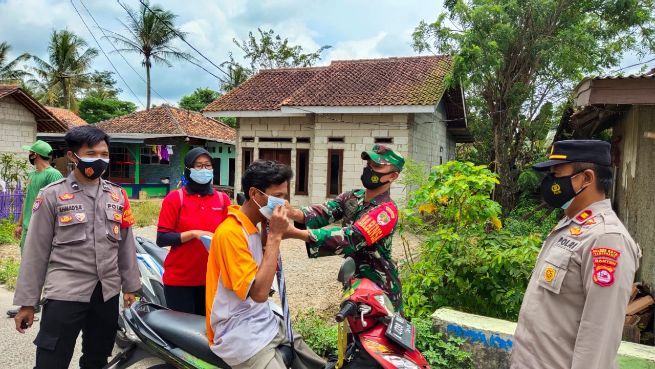 Anggota Koramil 13/Cisoka Jajaran Kodim 0510/Tigaraksa bersama Kades dan Binamas melakukan operasi PPKM mikro di Jalan Desa Pasir Gintung Kecamatan Jayanti Kabupaten Tangerang, Kamis (11/03/2021).