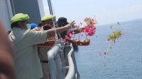 Mengenang sekaligus memberikan penghormatan kepada Prajurit KRI Nanggala-402 yang gugur saat melaksanakan tugas di perairan utara Bali, Komandan Pangkalan TNI Angkatan Laut (Danlanal) Banyuwangi Letkol Laut (P) Eros Wasis, M.Tr. (Han)., CTMP bersama Pemuda Panca Marga (PPM) dipimpin Sekjen PPM Pusat Berto Izaak Doko tabur bunga diatas geladak KRI Soputan-923, Selasa (4/5/2021).