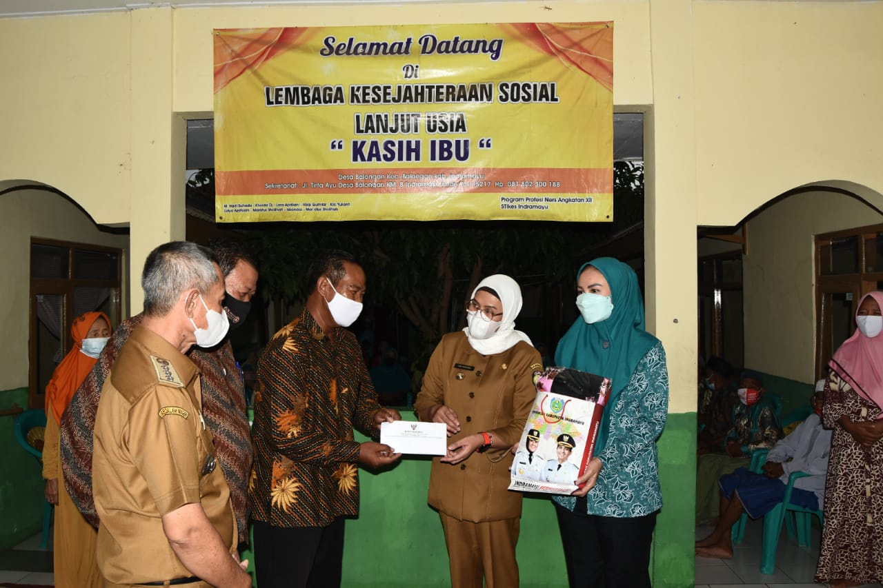Bupati Indramayu Nina Agustina, didampingi Ketua TP PKK Kabupaten Indramayu, Setyowati Anggraini Saputro dan pengurus TP PKK Kabupaten Indramayu, menyerahkan bantuan paket sembako dan uang tunai kepada warga Panti Jompo Tresna Whreda ‘Kasih Ibu’ di Jalan Tirta Ayu, Desa Balongan, Kecamatan Balongan, Kabupaten Indramayu, Selasa (11/5/2021).