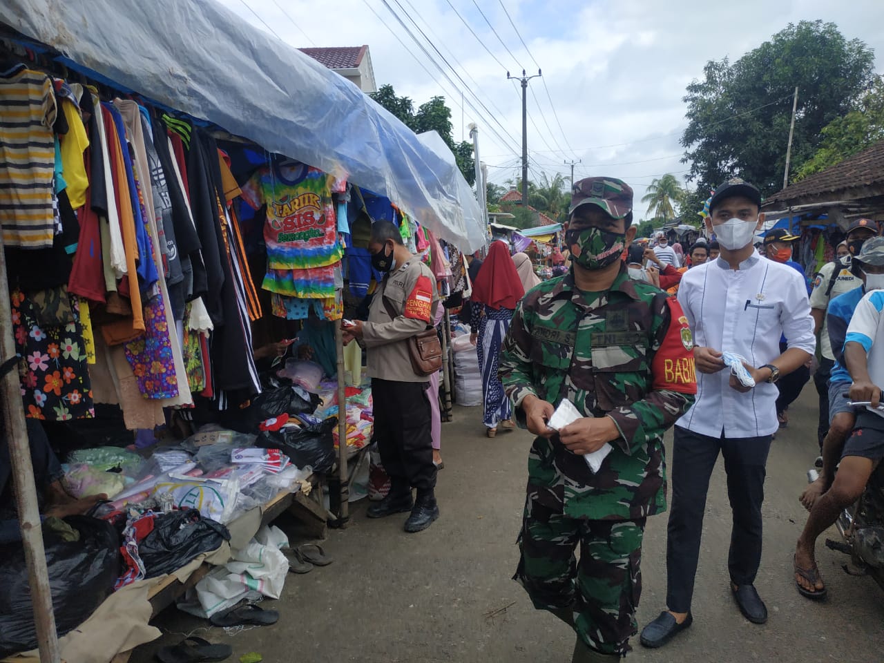 Terus upaya dalam mencegah penyebaran virus Covid 19, anggota Koramil 08/Kronjo Kodim 0510/Tigaraksa bersama tiga pilar membagikan masker kepada warga pengunjung dan pedagang pasar Kronjo untuk tetap memakai masker, Selasa (25/05/2021).