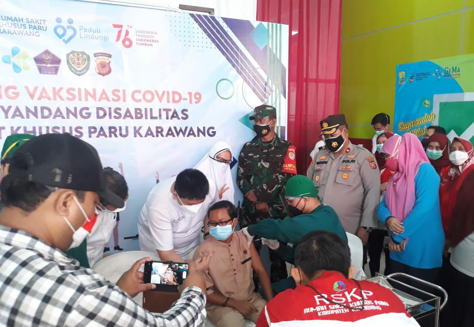 Kegiatan Launcing Vaksinasi Covid 19 bagi penyandang disabilitas yang bertempat di Rumah Sakit Paru Jatisari Desa Jatisari Kec. Jatisari Kab. Karawang, Rabu 18 Agustus 2021