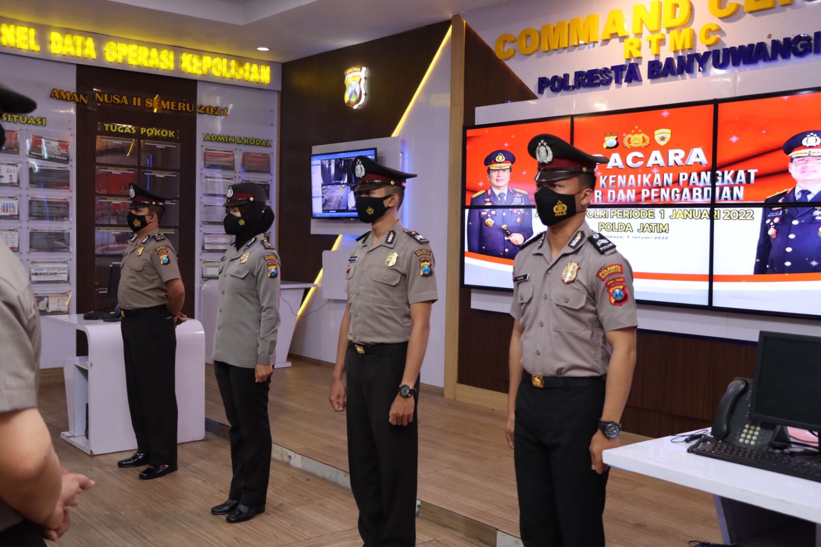 Sebanyak 128 anggota Polresta Banyuwangi Polda Jatim mendapatkan kenaikan pangkat satu tingkat lebih tinggi. Upacara kenaikan pangkat digelar secara serentak se jajaran Polda Jatim secara virtual live streaming dipimpin langsung oleh Kapolda Jatim, dan acara tradisi korp raport diselenggarakan di halaman depan Mapolresta Banyuwangi pada Senin (03/01/2022).