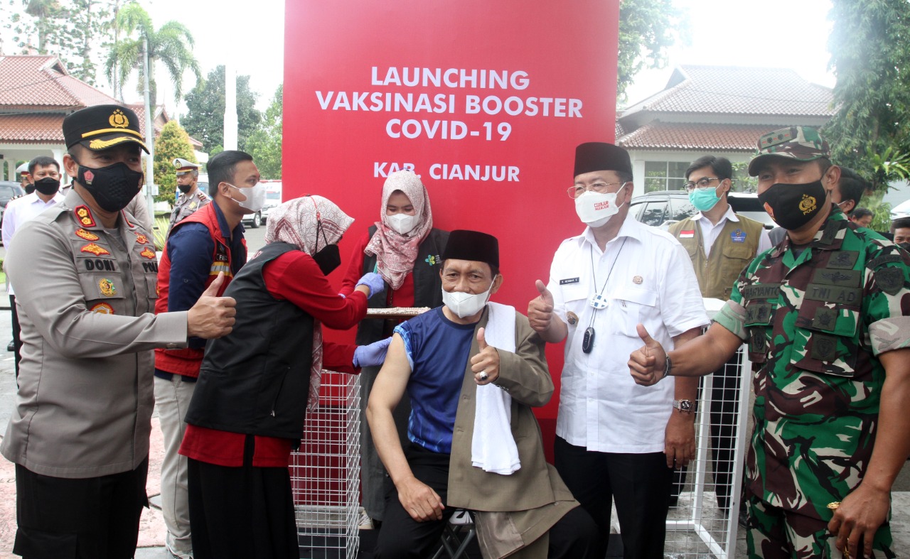 Pelaksanaan Vaksin Booster Covid 19 dilaksanakan di Halaman Pendopo Kabupaten Cianjur, Rabu (19/01/2022). Hadir dalam kegiatan tersebut, Bupati Cianjur, Herman Suherman, Kapolres Cianjur AKBP Doni Hermawan, Kejari Cianjur, Ricky Tommy Hasiholan, Ketua Pengadilan Agama