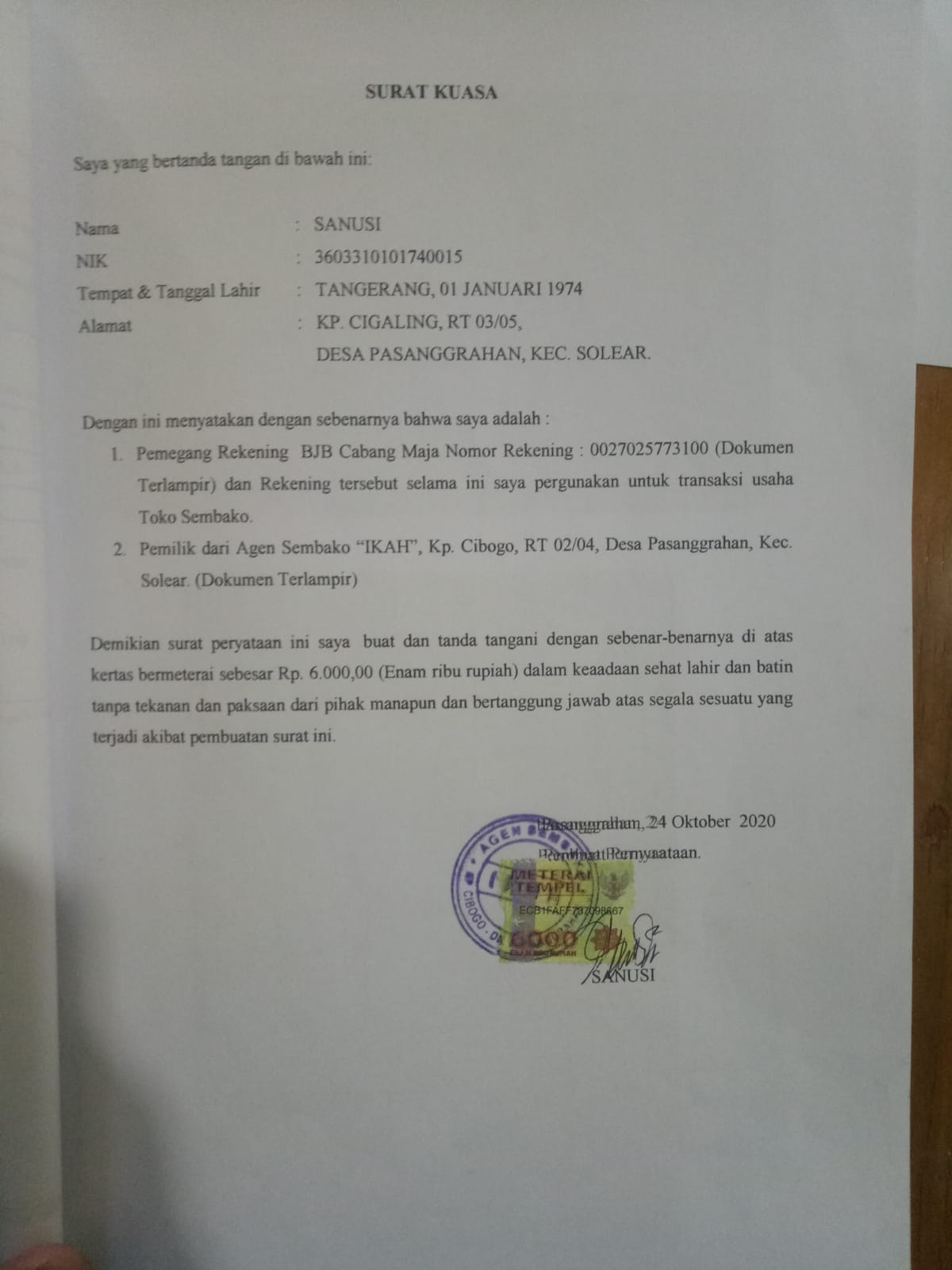 Yang menjadi pertanyaan adalah “mengapa di dalam surat kuasa disebutkan pemilik warung I? Sesuai dengan surat kuasa tersebut nama Sanusi warga Kp. Cigaling, Rt 03/05. Ds Pasanggrahan kecamatan Solear kabupaten Tangerang, dalam hal tersebut sesuai dengan “Surat kuasa” yang di buat dan di tanda tangani oleh Sanusi di atas materai 6000, dan cap stempel Agen Sembako I pada tanggal 24 Oktober 2020, dan di surat kuasa juga disebutkan (Demikian surat pernyataan ini saya buat dan di tanda tangani dengan sebenar-benarnya bermaterai Rp 6000 (enam ribu rupiah), dalam keadaan sehat lahir batin tanpa tekanan dan paksaan dari pihak manapun dan bertanggung jawab atas segala sesuatu yang terjadi akibat pembuatan surat ini), dengan adanya surat kuasa kepemilikan Agen Sembako I yang di duga telah di rekayasa untuk mendapatkan keuntungan dengan pencairan dana bantuan Provinsi.