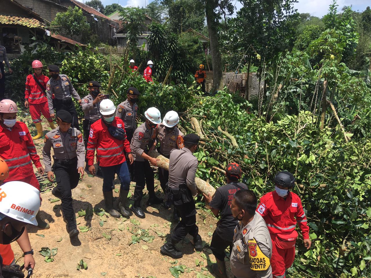 Tim SAR Batalyon B Pelopor Satuan Brimob Polda Jabar diterjunkan untuk melaksanakan evakuasi dan pembersihan pohon-pohon tumbang ataupun puing-puing rumah warga yang terkena dampak dari angin puting beliung yang terjadi di Kampung Sinagar Kolot RT 02/08 Desa Nagrak Kecamatan Nagrak Kabupaten Sukabumi, Sabtu (12/3/2022).