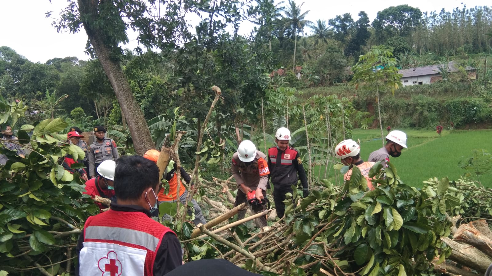 Saling bergotong royong dan dengan alat yang dibawa, anggota memotong dahan-dahan pohon yang tumbang menghalangi akses jalan warga maupun pohon yang menimpa rumah warga akibat angin puting beliung.