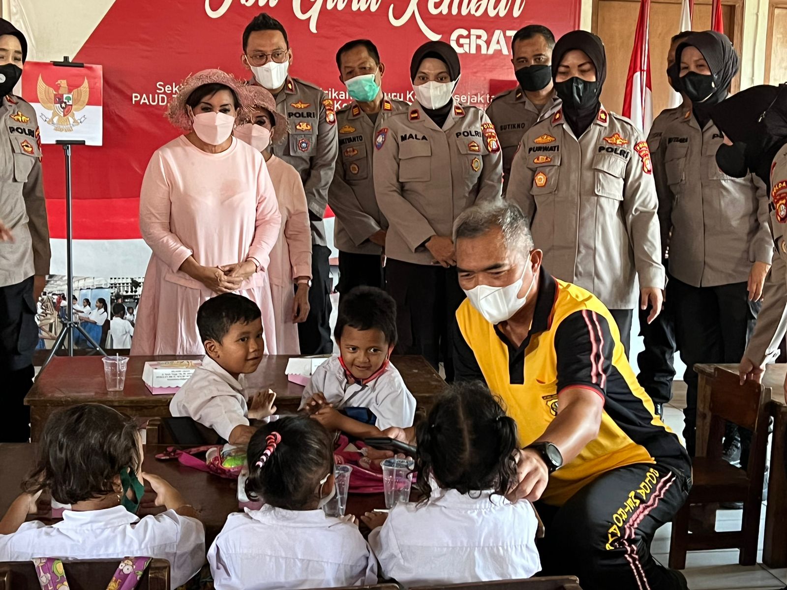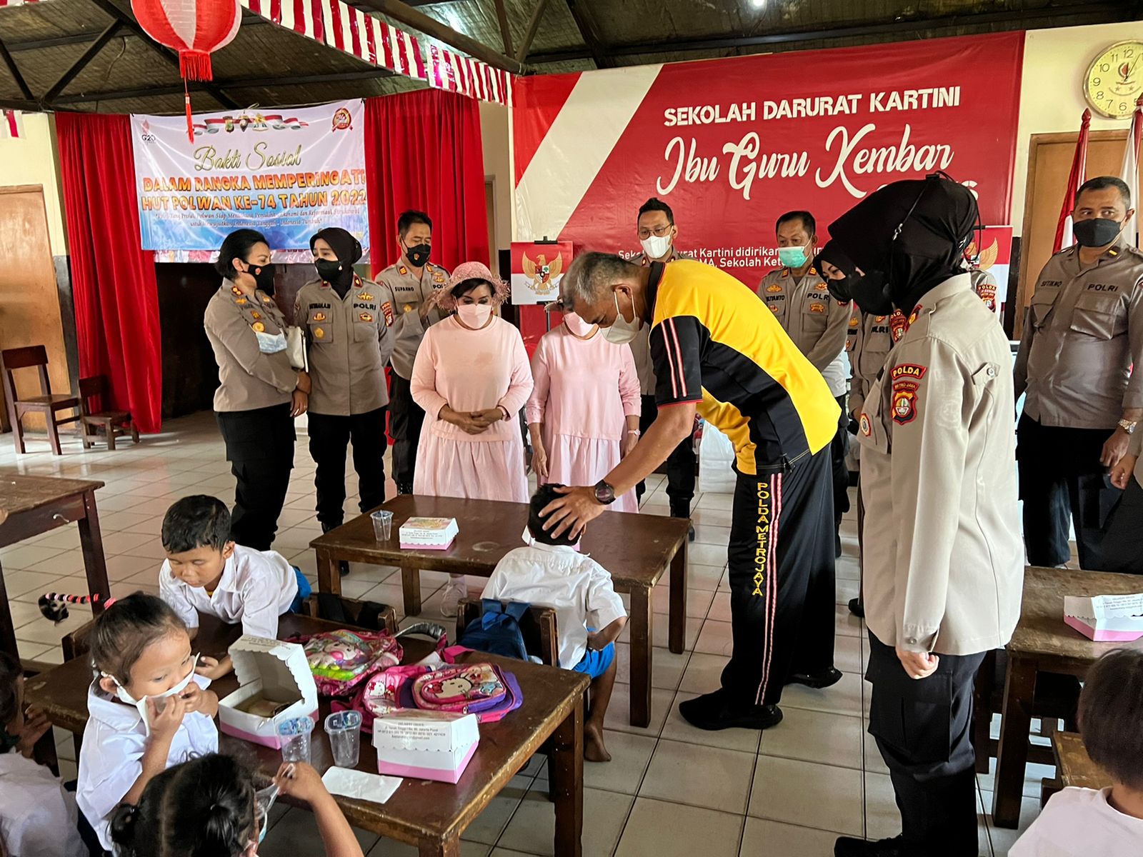 Giat tersebut Dipimpin Kabagbinops Ditbinmas Polda Metro Jaya AKBP Josepthien Vivick Tjangkung, S.Sos., M.I.Kom didampingi Polwan Ditbinmas Polda Metro Jaya menggelar berbagai kegiatan kali ini melakukan kegiatan Bakti Sosial bersama dengan murid Sekolah Darurat Kartini.