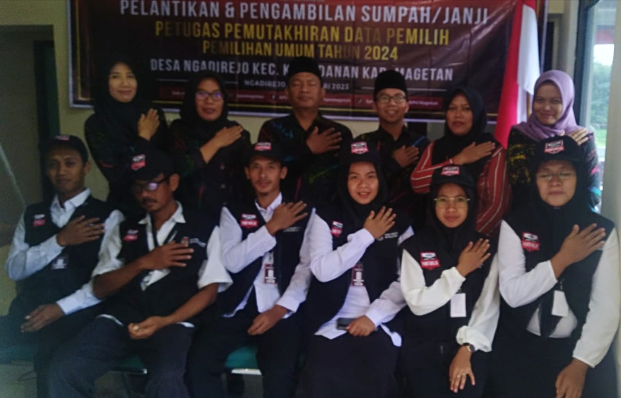 Atas nama KPU Kabupaten Magetan PPS desa Ngadirejo melaksanakan kegiatan Pelantikan Petugas Pemutakhiran Daftar Pemilih (Pantarlih) Pemilu 2024 , kegiatan pelantikan petugas pantarlih dilanjutkan dengan mengikuti apel kesiapan dilanjutkan dengan bimtek, selanjutnya di sore harinya mereka langsung bekerja mendatangi masyarakat desa masing-masing sesuai wilayah kerjanya.