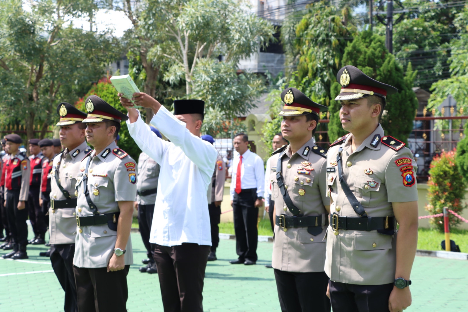 Upacara sertijab dipimpin Kapolresta Banyuwangi Kombes Pol Deddy Moury Millewa, S.H., S.I.K., M.I.K., dan dihadiri Para Pejabat Utama (PJU) dan Kapolsek jajaran, para Perwira, Bintara, dan ASN.