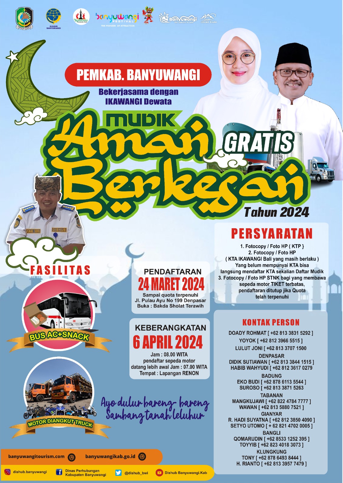 Pemerintah Kabupaten (Pemkab) Banyuwangi bekerjasama dengan Ikawangi Dewata mengumumkan angkutan mudik gratis aman berkesan tahun 2024 yang dapat dimanfaatkan untuk pulang kampung halaman pada masa lebaran.