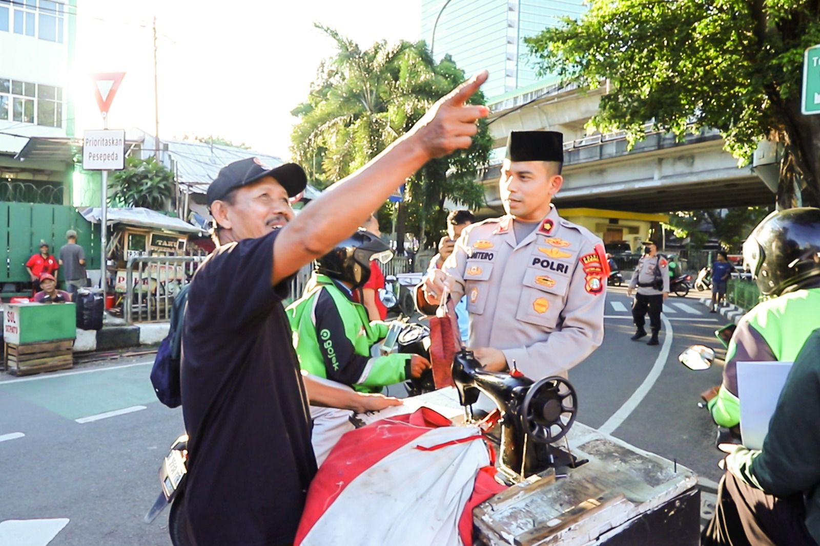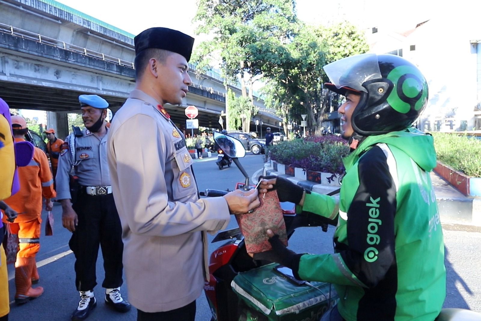 Selain itu, petugas juga memberikan bingkisan berupa Takjil kepada petugas kebersihan yang sedang bersih-bersih di sekitar jalan tersebut.