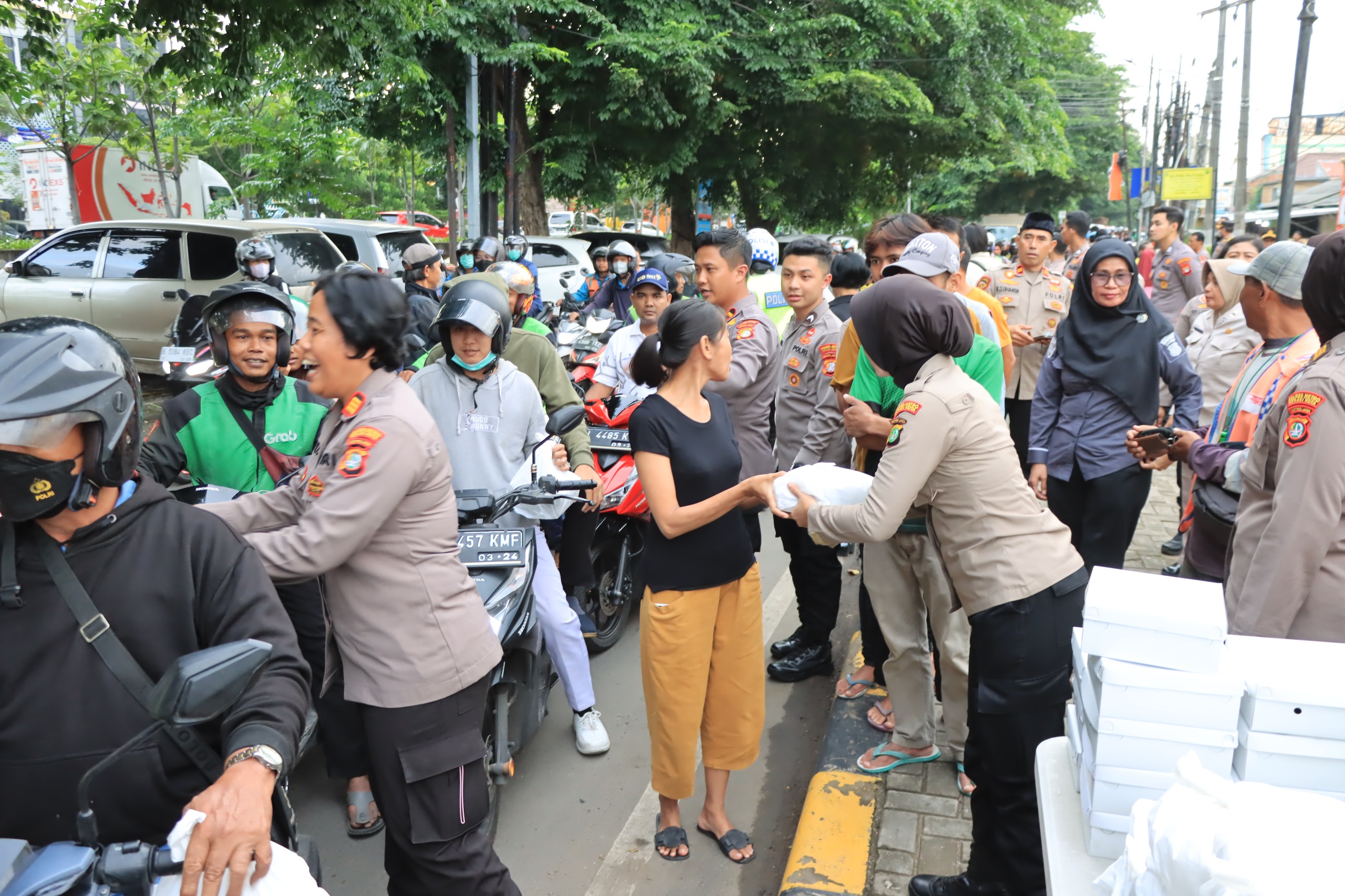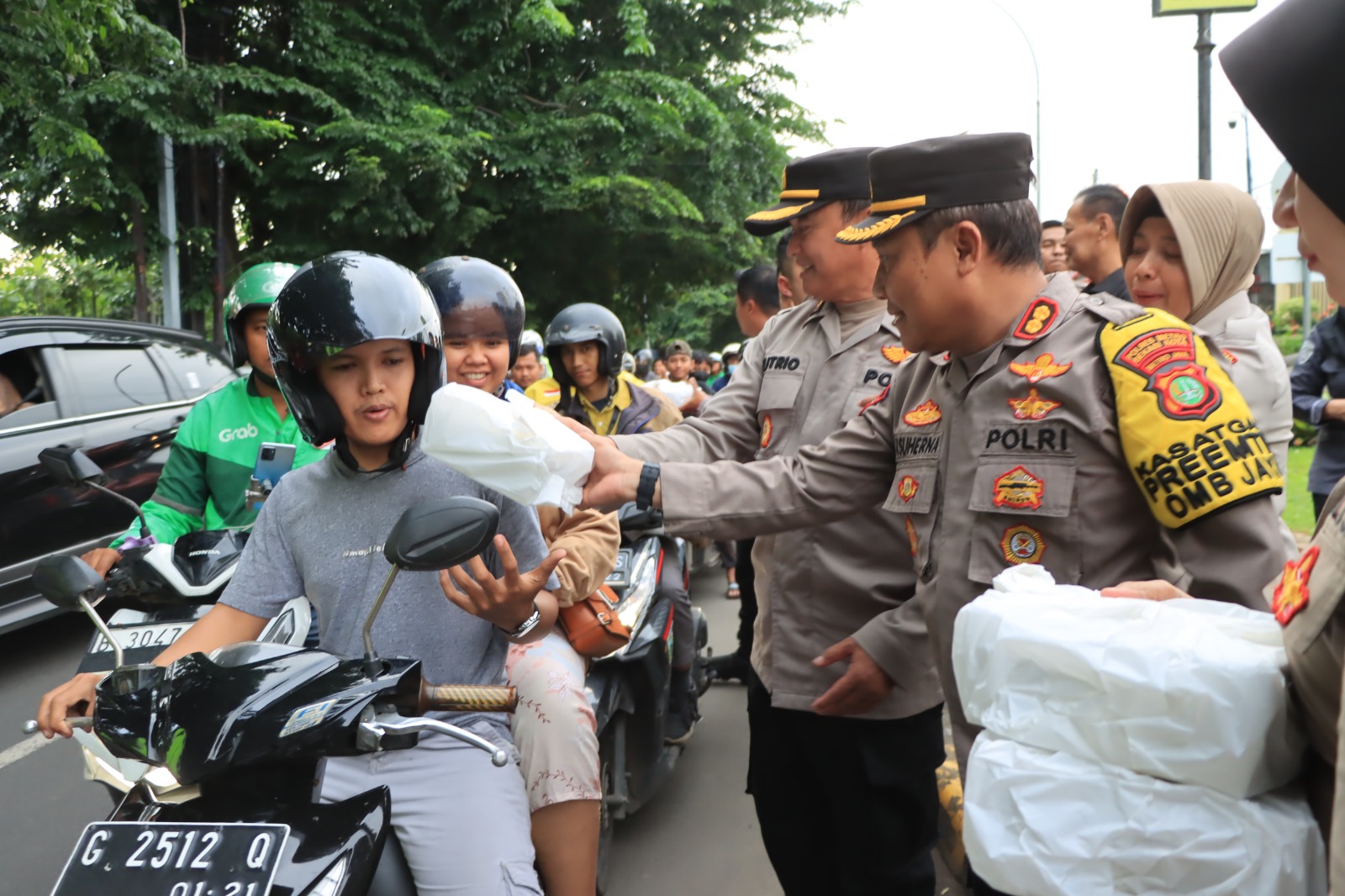 Para PJU Polres Metro Bekasi Kota beserta jajaran ini menghentikan pengendara untuk membagikan Takjil. Sebanyak 150 Takjil disiapkan dan langsung dibagikan secara gratis kepada masyarakat pada Jumat sore (22/3/2024).